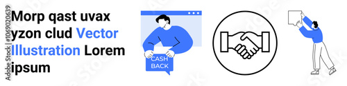Man holding cash back coupon, handshake icon, person with megaphone. Ideal for promotions, business agreements, announcements, marketing, customer engagement, advertising, online campaigns. Landing