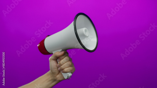 man, megaphone, purple, communication, background, hand, vibrant, holding, male, isolated, announcement, speaker, voice, sound, alert, volume, expression, colourful, attention, expressive, visual, message, statement, command, loud, noise, call, notice, broadcast, explanation, clear, simple, gesture, tool, device, sharpened, central, spotlight, present, engage, inform, announce, media, motivation, authority, figure, red, white, contrast