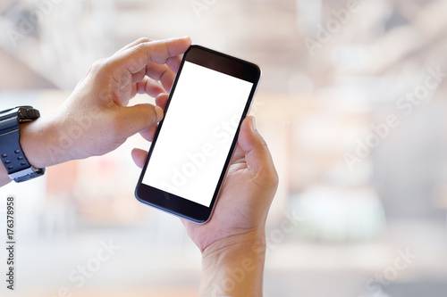 Man holding smart phone with blurred background. For Graphic display montage.
