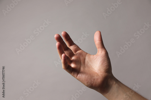 Man holding something in hand on grey background, closeup. Space for text