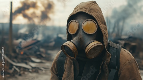 Man in a gas mask standing amidst a war-torn landscape, with smoke rising from the ruins, symbolizing the aftermath of a nuclear disaster.