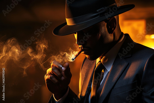 man, black, fedora, dark, suit, smoking, cigar, dimly, lit, room, smoke, mystery, black, detective, crime, thriller, suspense, atmosphere, mood, cinematic, dramatic, film, vintage, retro, classic, style, fashion, elegance, sophistication, luxury, gentleman, obscured, face, rectangle, light, shining, corner, mafia, gangster, secret, agent