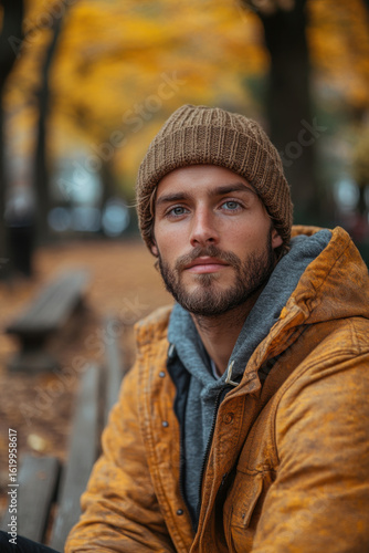 man, brown, jacket, hat, sitting, bench, relaxation, contemplation, solitude, stylish, fashion, casual attire, autumn, peaceful, calm, park, nature, adult, male, thinking, resting, alone, serene, leisure, outdoors, lifestyle, cosy, warm, comfortable, autumn, headwear, wooden, public, calmness, city, urban, sitting down, vintage