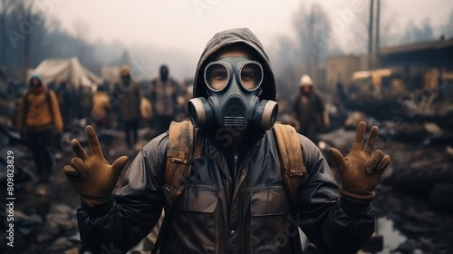 gas-mask, survivor, peace sign, chaos, disaster, overall, man, environment, protection, safety, hazard, outdoors, apocalypse, crisis, emergency, survival, destruction, people, glove, crowd, goggles, desolation, backpack, sombre, dramatic, intense, rebellion, hope, camp, tent, smoke, winter, military, equipment, mask, urban, wasteland, risk, adventure, resilience, courage