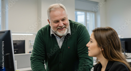 office, man, woman, computer, sweater, smiling, business, communication, conversation, work, employee, desk, indoor, beard, adult, caucasian, professional, team, meeting, collaboration, workspace, corporate, technology, monitor, manager, leadership, mentor, guidance, support, interaction, bright, lighting, window, shirt, jacket, hair, earring, white, green, black, table, furniture, modern, design, talk