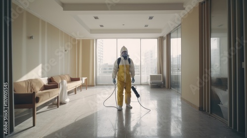 man, suit, room, empty, building, spray, clean, cleaning, protection, safety, pandemic, virus, germ, sanitizing, hazard, equipment, glove, mask, face, coverall, protective, gear, indoor, interior, apartment, office, hospital, health care, health, medicals, security, men at work, professional, service, business, industry, sprayed, chemical, solution, sterilize, sanitation, containment, quarantine, epidemic, outbreak