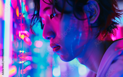 Man in Neon Lights with Digital Reflection