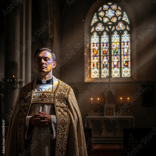 man, church, robe, window, religious, priest, dark, light, candle, altar, clergy, prayer, faith, holy, divine, spiritual, worship, belief, christian, stained-glass, holy place, holy spirit