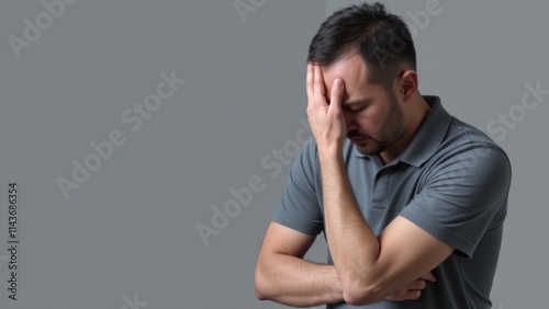Man in Polo Shirt Displaying Signs of Stress, Eyes Shut, Hand to Forehead, Amidst a Solid Background