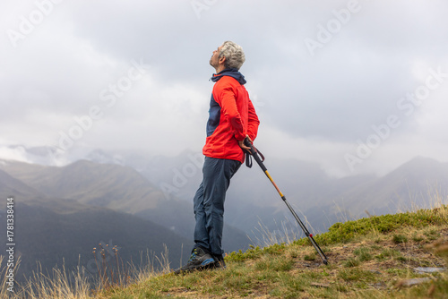 man, mountain, hiking, ridge, trekking, pole, landscape, scenery, cloudy, jacket, outdoors, adventure, nature, exploration, summit, hill, terrain, backpacking, walking, travel, wilderness, panorama, peak, climb, sport, fitness, cloud, freedom, relaxation, activity, journey, trail, red, leisure, escape, vista, view, sky, peaceful, inspiring, half face