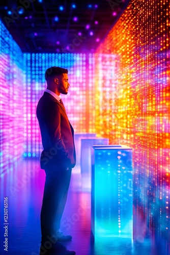 technology, futuristic, interactive, digital, vibrant, colourful, man, suit, studio, display, lighting, modern, high technology, environment, engagement, innovative, design, sleek, indoor, exhibit, media, installation, art, contemporary, graphic, male, person, standing, striking, neon, illuminated, visual, communication, conceptual, stylish, electronic, background, creative, advancement, atmosphere, life events, connection, innovation