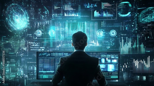 man, suit, analysing, datum, screen, multiple, display, digital, monitor, computer, technology, information, graph, chart, statistic, network, code, programming, interface, futuristic, cyberspace, system, analysis, intelligence, business, finance, research, development, transformation, future, innovation