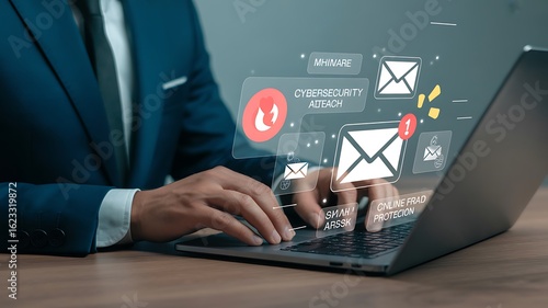man, suit, laptop, electronic mail, icon, screen, display, typing, hand, technology, business, professional, cyberspace, network, communication, online, security, protection, fraud, attack, threat, datum, digital, information, system, software, computer, device, workspace, office, desk, table, modern, futuristic, virtual, interface, overlay, connection, access, alert, warning