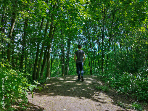 sun, scenic, sunny, season, sunlight, path, leaf, day, wood, hiking, light, wood, natural, tree, landscape, environment, summer, green, nature, forest, tree, thin, park, hill, edge, t-shirt, t-shirt, shirt, man, silesia, europa, poland, wroclaw