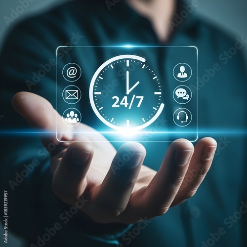 Man interacting with a futuristic holographic display showing a 24 7 clock and icons