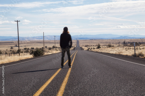 Man is standing in the middle of the long road during a vibrant sunny day. Taken in Oregon, North America.