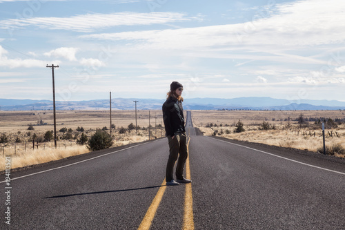 Man is standing in the middle of the long road during a vibrant sunny day. Taken in Oregon, North America.