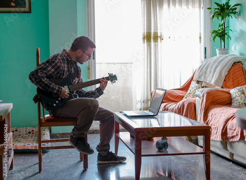 guitar, learn, interior, adult, leisure, confident, blues, indoor, pillow, music, man, musical, stylish, profession, dandy, guy, portrait, guitarist, home, teacher, instrument, jazz, sofa, haircut, musician, student, hobby, perform, play, rehearsal, photogenic, young, electric, elegant, male, masculine, tutor, occupation, rock, practice, entertainment, laptop, computer, chord, creativity, apartment