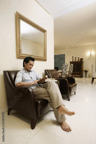 holding, sitting, smiling, young adult, full-length, half face, carefree, cheerful, confidence, content, healthy lifestyle, avocation, organisation, planning, relaxation, well-being, asian ethnicity, man, living room, one person, casual clothes, couch, mirror, organiser, indoor, lifestyle