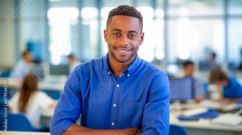 Man Looks at the camera and smile. Black businessman in casual blue wear in nice modern office. Concept of success in business. Ai generative.