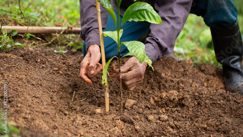 Man planting coffee seedlings in a coffee plantation surrounded by soil and natural