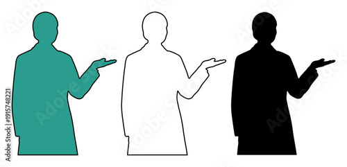 man, presentation, idea, concept, offering, gesture, hand, open, three, style, silhouette, outline, teal, black, white, professional, business, communication, showing, explaining, proposal, option, choice, blank, copy, space, single, person, isolated, studio, graphic