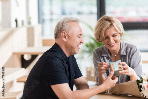 gift, box, holiday, people, flower, family, affectionate, date, couple, cafes, together, togetherness, attractive, casual attire, mature, closeness, adult, wife, husband, human relationships, presenting, two people, middle-aged, gift box, cafes, caucasian woman