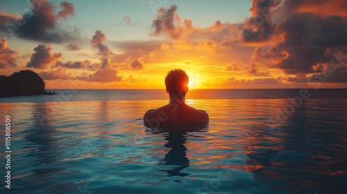 Man relaxing in infinity pool at sunset, enjoying peaceful ocean view. Scenic travel, luxury relaxation, warm colors, serene moment, tropical getaway, solitude.