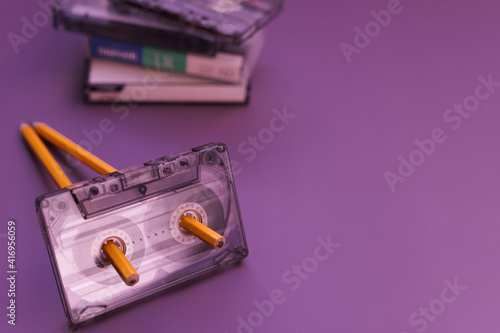 nostalgia, retro, cassette, tape, stereo, crayons, hand, hand, man, hobby, purple, neon, trend, colours, isolated, white, money, office, paper, business, pen, object, school, equipment, tool, sharpener, metal, finance, currency, red, technology, education, puncher, box, computer