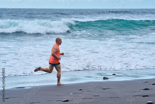 running, beach, man, ocean, barefoot beach, sand, wave, athletic, jogging, water, splash, volcanic, coastline, fitness, short, muscle, strength, motion, action, wet, tropical, summer, training, exercise, male, determination, sea, energy, sporty, healthy, strong, travel, holiday, tour tourism, warm, coastal, movement, physical, active, dynamic, tanned, shoreline, shirt, tee, orange, sharpened