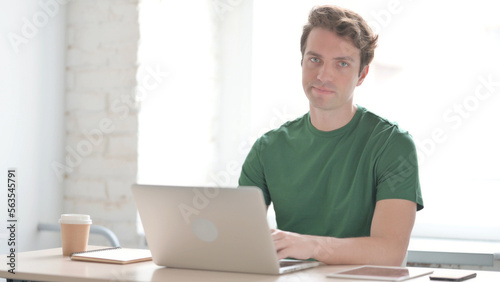 Man Shaking Head in Rejection While Working on Laptop