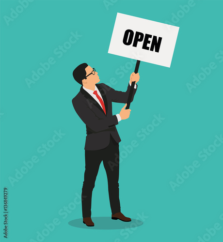 happy, business, illustration, vector, man, signs, open, person, sale, character, flat, board, cartoon, businessman, holding, people, background, symbol, poster, announcement, hand, icon, work, banner, hold, isolated, start, signs, advertisement, blank, empty, figure, shop, estate, showing, entrance, white, signboard