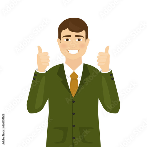 Man shows thumbs up isolated on white background. Modern business man showing okay sign. For web site, poster, placard and app. Vector illustration