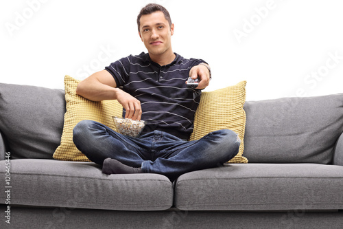 changing, grooved, man, sofa, 20s, adult, background, casual attire, caucasian, change, expression, furniture, guy, isolated, leisure, lifestyle, looking, male, 1, person, pillow, popcorn, pose, posing, relax, relaxation, relaxed, remote, search, seated, single, to sit, sitting, snack, studio, television, television, watching, white, young