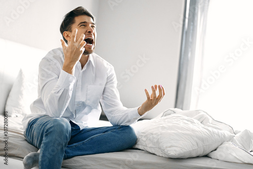 bed, man, sad, couple, home, bedchamber, sitting, sleepy, people, serious, night, cephalalgia, thinking, to sit, male, anxious, ill, alone, insomnia, photogenic, sleepy, loneliness, lifestyle, pain, head, bored, white, sick, silhouette, pajama, down, bad, face, side, look, ache, fatigue, grieved, apartment, regret, thinks, caucasian, sorrowful, problem, resting, stress, stressed, depressed, morning, arousing