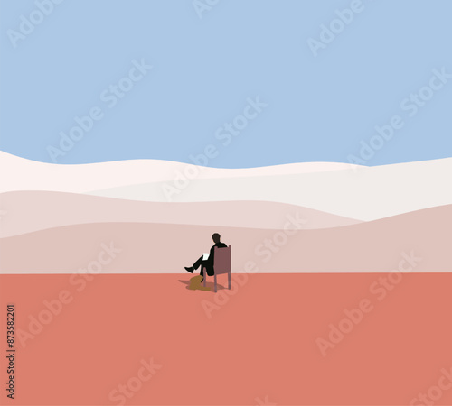 Man sitting on the chair drawing picture pink mountain landscape under blue sky. The artist Painting in nature. Creativity minimalist concept