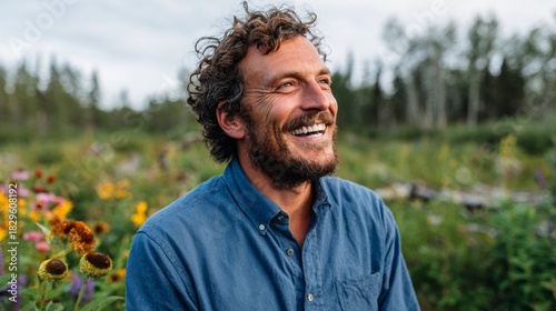 man, smiling, beard, blue shirt, outdoors, garden, flower, happy, nature, relaxed, casual attire, sunny, daytime, summer, green plant, field, joyful, content, healthy, bearded, hipster, farmer, gardener, rural, countryside, happiness, smile