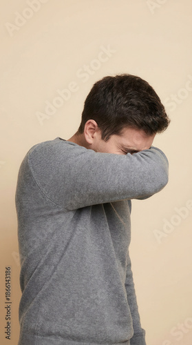 sneezing, elbow, gesture, hygiene, disease, prevention, man, health, disease, protection, virus, cold, flu, care, safety, infection, clean, practice, precaution, disease, sneeze, handkerchief, cough, tissue, allergy, symptom, behaviour, male, person, adult, sweater, clothes, wool, casual attire, seasonal, air, widener, transmission, contact, response, indoor, isolated, face, action, individual, mindfulness