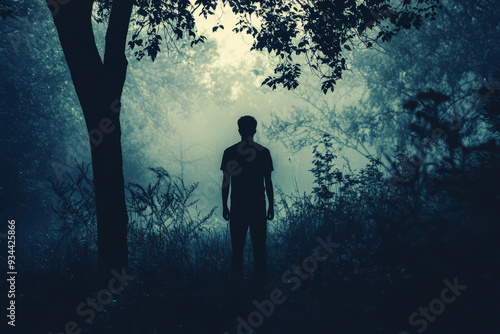 man, forest, tree, sunset, dusk, dark, alone, solitude, nature, outdoors, wood, evening, light, silhouette, standing, back, backview, contemplation, peaceful, calmness, serenity, calm, quiet, thinking, landscape, scenic, environment, natural, twilight, shadow, mysterious