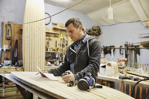 Man standing in a workshop with a wooden surf board, holding paper and pen.