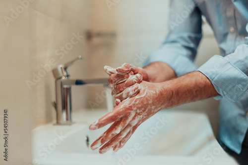 Man using soap and washing hands under the water tap. Hygiene concept hand closeup detail.