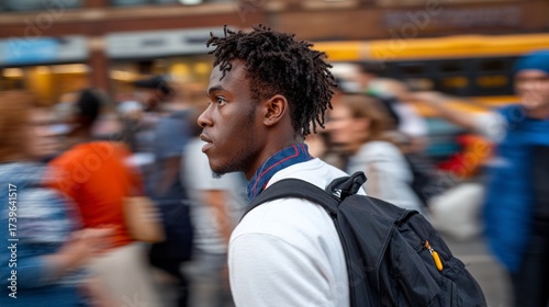 person, man, student, backpack, street, urban, city, crowd, blurred, motion, walking, public, people, diversity, travel, transportation, fashion, casual attire, activewear, sneaker, hair, short, black, male, youth, school, education, backpack, photo, candid, lifestyle, modern, contemporary, fashionable, trendy, hip
