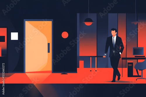 man, walking, office, interior, suit, corporate, modern, geometric, design, work, professional, businessman, stylish, indoor, space, illustration, art, graphic, contemporary, desk, chair, computer, lamp, door, window, leaning, standing, attaching, person, workplace, career, employee, executive, leadership, minimalist, style, clean, vibrant, warm, lighting