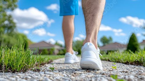 walking, man, path, suburban, sunny, lifestyle, healthy, day, exercise, fitness, leg, shoe, sneaker, white, summer, nature, green, grass, blue, sky, cloud, house, foot, active, wellness, well-being, sport, run, jogging, movement, person, road, ground, walk, stroll, freedom, energy, fresh, air, relaxation, life, recreation