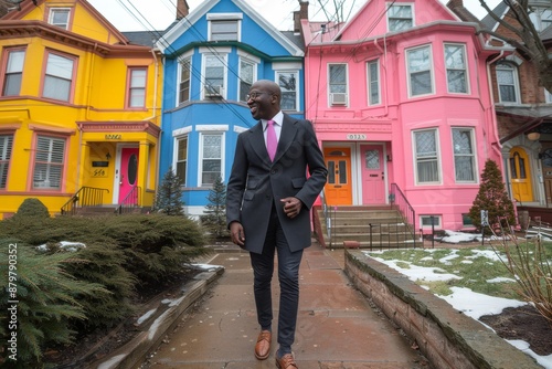 man, walking, sidewalk, house, colourful, yellow, blue, pink, winter, snow, suit, attaching, street, neighbourhood, urban, city, front, yard, brown, green, step, door, window, home, building, landscape, architecture, cold, season, scenery, exterior, residential, bright, cheerful, happy, sunny, vibrant, stylish, fashion