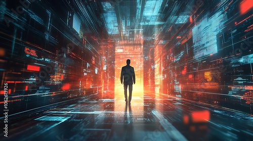 digital, man, walking, future, tunnel, light, bright, glowing, progress, hope, technology, abstract, futuristic, science, fiction, datum, code, network, cyberspace, virtual, reality, silhouette, dark, red, blue, orange, graphic, design, art, illustration, concept, journey, path, destination, dynamic, perspective, fantasy, dream