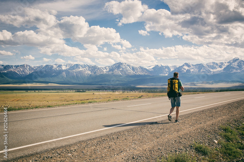 Man walks along an asphalt road with a backpack on his back overlooking the mountains