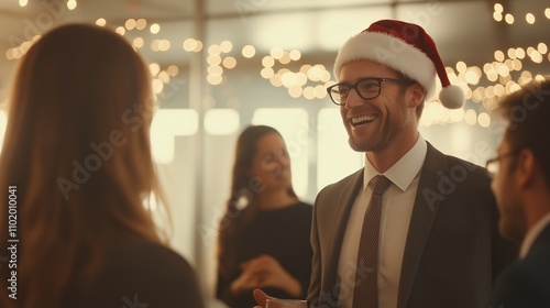 holiday, office, party, celebration, santa, hat, co-worker, conversation, light, festive, gathering, joy, laughter, suit, decoration, smile, winter, drink, workplace, event, cheer, entertainment, tradition, networking, fun, evening, socialising, casual attire, attire, joyfulness, friendship, team, building, culture, corporate, community, spirit, festivity, happiness, relaxation, togetherness, employee, seasonal, greeting, connection, cheerfulness, businessman, meeting