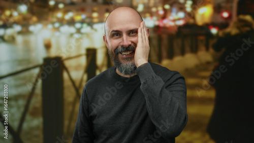 man, beard, laughing, urban, street, night, light, city landscape, ambience, joyous, smile, happy, outdoors, male, bald, background, city, road, evening, person, adult, fashion, scenic, modern, lifestyle, expression, portrait, casual attire, scene, caucasian, mature, photogenic, friendly, gesture, sharpened, view, laughter, charming, environment, style, alone, moment, atmosphere, travel, relaxed, bright, dynamic
