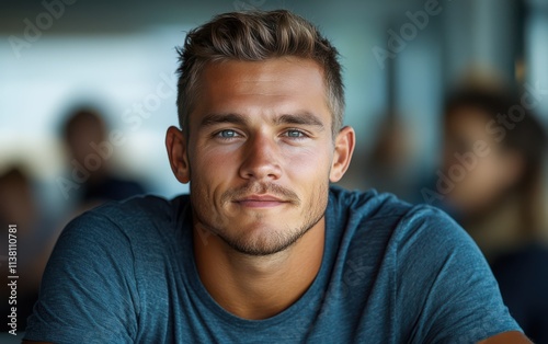 man with casual t-shirt is smiling at the camera, blurred room background